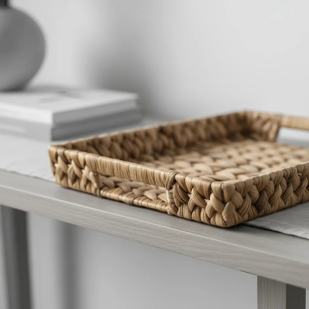 Está tejida en fibra natural, lo que le da un aspecto cálido y orgánico.