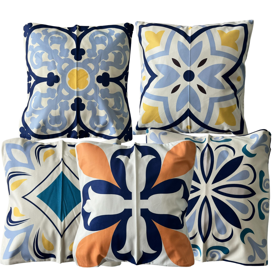 Estas fundas de cojín 45x45 cm combinan practicidad y diseño con una estética inspirada en las tradicionales mayólicas mediterráneas, pensadas para resaltar cualquier rincón de tu casa.