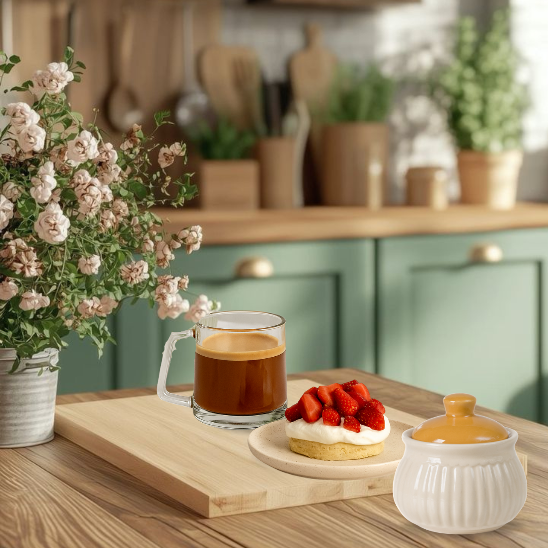 Este set incluye 6 tazas de vidrio transparente con diseño moderno y elegante, perfectas para café, té, leche o infusiones.